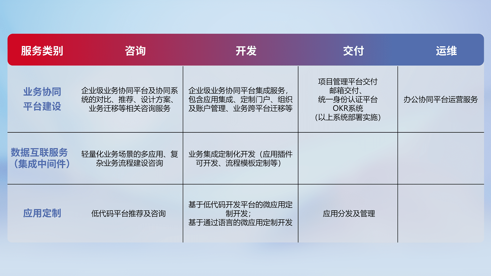 针对钉钉、、、企微、、、、IDaas等平台级产品提供产品的规划、、、方案、、、、交付、、、、定制化开发等服务,,实现如统一协同办公、、、智能客户服务、、、、混合会议管理、、、智能数据查询、、、等业务场景,,,,实现数字化转型。。。